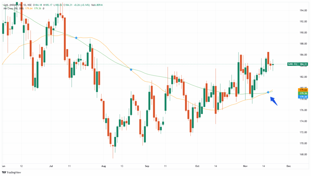 With market capitalization of Rs. 1,21,014 cr, the shares of GAIL (India) Ltd are closed at Rs. 184.05 per share, from its previous close of Rs. 184.05 per share. The golden crossover took place on November 18, 2025, at a price of Rs. 179.19.