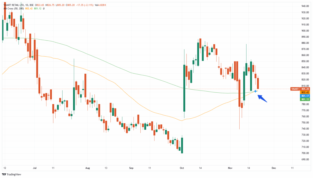With market capitalization of Rs. 6,392 cr, the shares of V-Mart Retail Ltd are closed at Rs. 805.20 per share, from its previous close of Rs. 822.55 per share. The golden crossover took place on November 19, 2025, at a price of Rs. 801.17