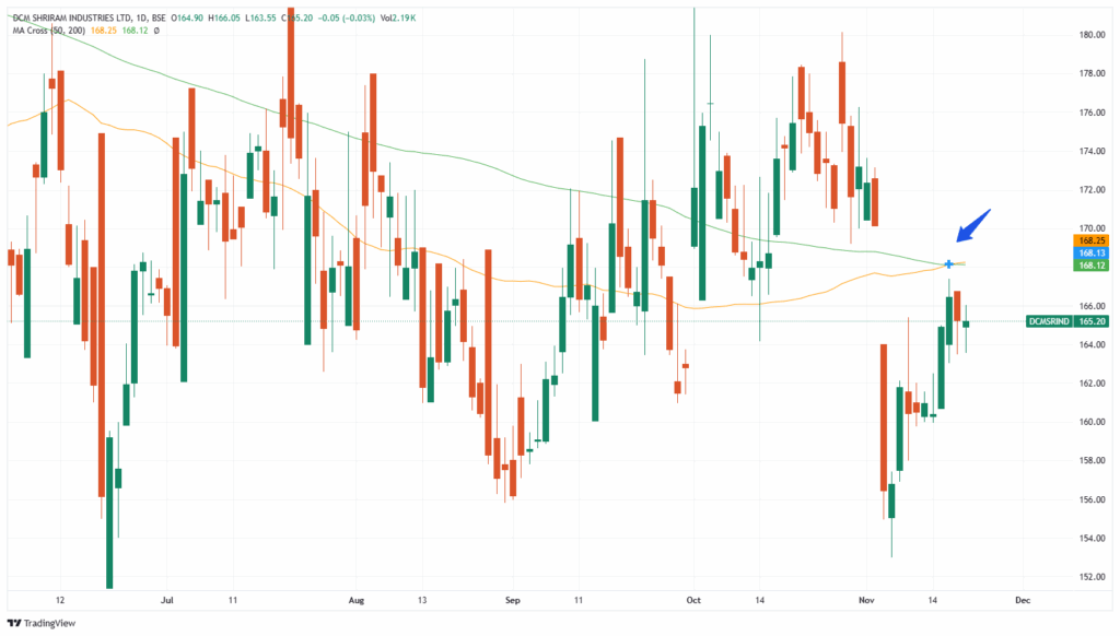 With market capitalization of Rs. 1,437 cr, the shares of DCM Shriram Industries Ltd are closed at Rs. 165.20 per share, from its previous close of Rs. 165.25 per share. The golden crossover took place on November 19, 2025, at a price of Rs. 168.13 with low volumes of 709.