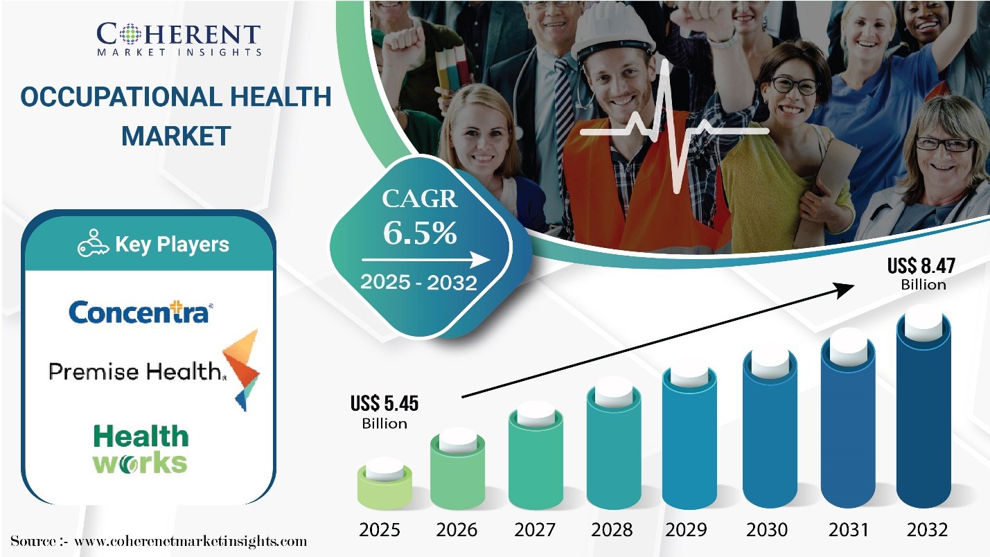 Burlingame, CA, April 01, 2025 (GLOBE NEWSWIRE) — In terms of value, The Global Occupational Health Market size was valued at USD 5.45 Billion in 2025, is on a trajectory of rapid expansion, with projections indicating it will soar to USD 8.47 Billion by 2032, growing at a CAGR of 6.5% from 2025 to 2032, as per a recent report by Coherent Market Insights.