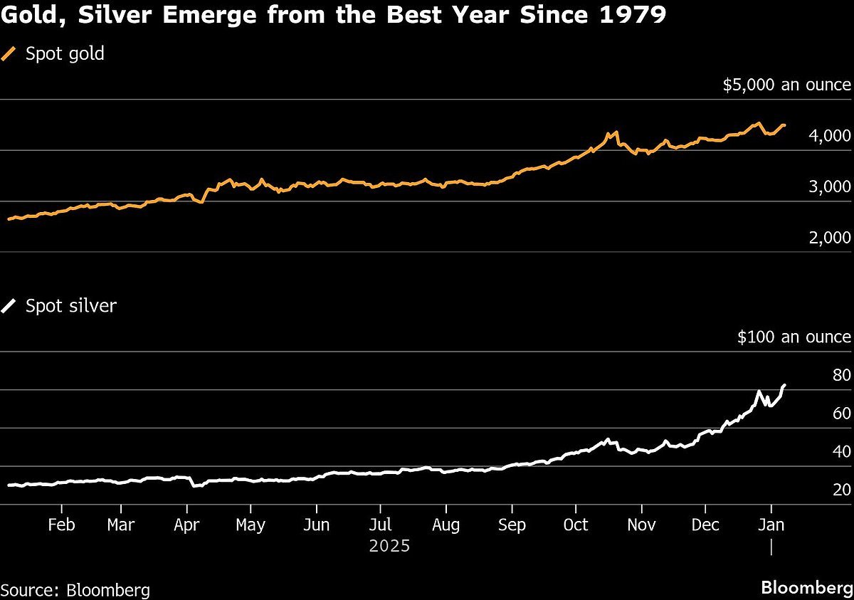 Gold is fresh from posting its best annual performance since 1979, hitting a series of record highs throughout last year with support from central-bank buying and inflows to bullion-backed exchange-traded funds. Silver’s rally was even more spectacular — the white metal gained nearly 150% — as it also benefited from a shortage of metal and the potential of US import tariffs that’s keeping significant supplies locked up in New York.
