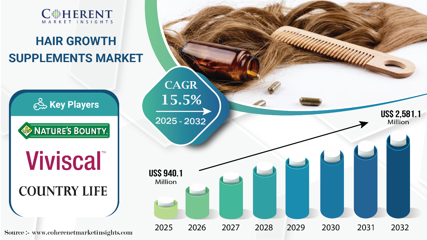 According to Coherent Market Insights (CMI), the global hair growth supplements market size is forecast to grow from USD 940.1 Mn in 2025 to USD 2,581.1 Mn by 2032.