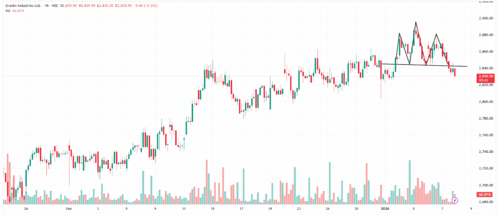 Synopsis: Grasim Industries Ltd has exhibited a bearish reversal pattern on its 1‑hour chart. The stock has formed a head and shoulders, signalling potential near-term downward momentum.