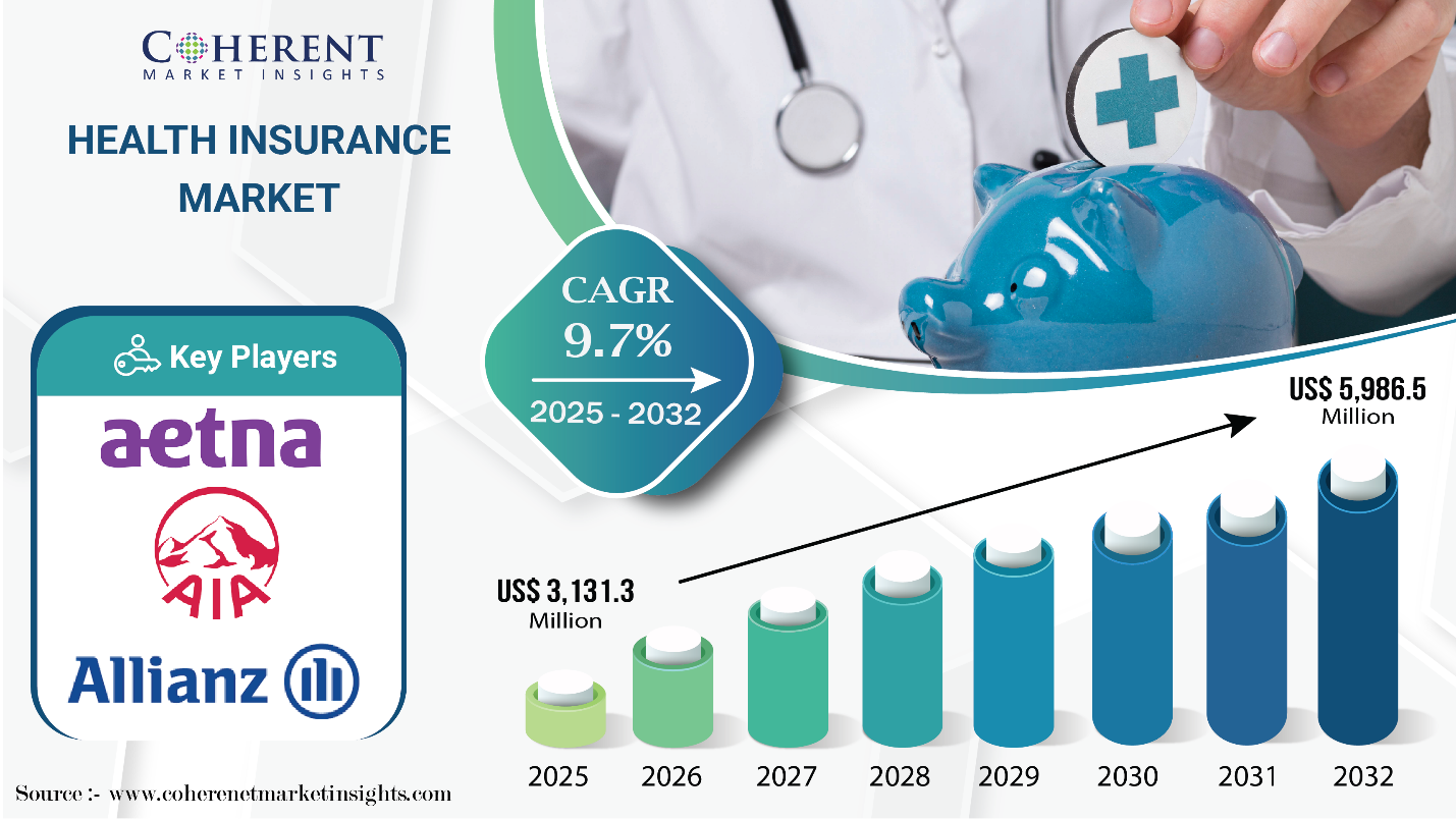 According to Coherent Market Insights (CMI), the global health insurance market size is projected to expand at a CAGR of 9.7%, reaching USD 3,131.3 Mn in 2025 and USD 5,986.5 Mn by 2032.