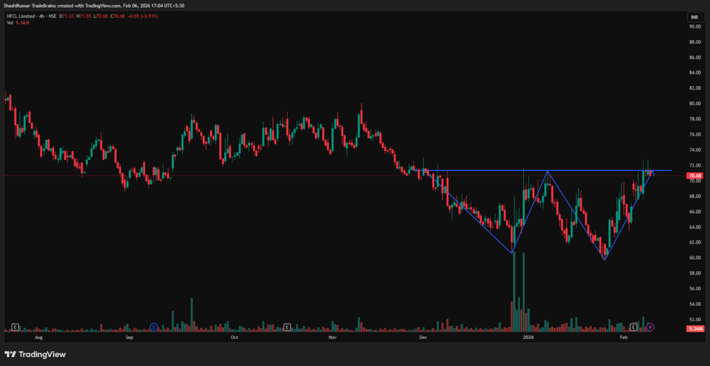 Synopsis: HFCL Ltd has formed a double-bottom pattern on the 4-hour chart, signalling a potential near-term bullish reversal.