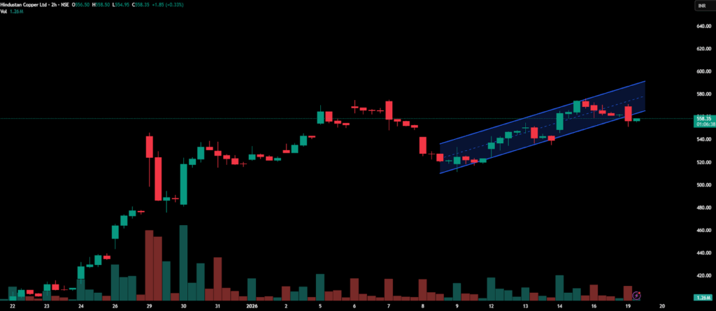 Hindustan Copper Ltd, after a phase of steady gains in recent sessions, formed an ascending channel on its 30-minute chart. A breakdown below the channel signals a potential bearish reversal.