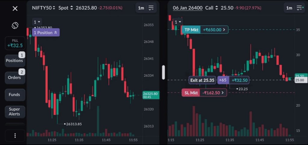 Sahi’s Dual Charts view for calls and puts in scalper mode