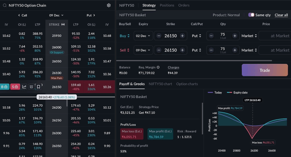 Sahi supports advanced Basket Analysis, allowing you to assess multi-expiry strategies, view hedges and rollovers, and analyse payoff structures with real-time Greeks before committing capital.