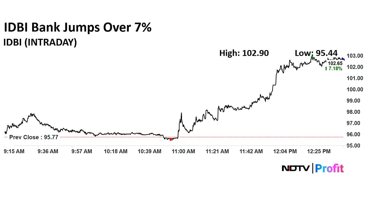 IDBI Bank share price rose 7.75% to Rs 102.90 apiece, the highest level since July 3. It has been rising for the second session in a row. The stock was trading 7.54% higher at Rs 102.90 apiece as of 1:02 p.m., as compared to 0.08% decline in the NSE Nifty 50 index.
