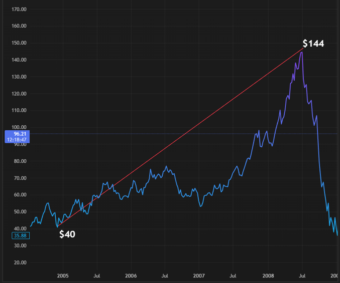 Go back to 2004. Crude oil was around $40 a barrel. Within four years, it hit $144. For India which imports roughly 85% of its crude that was a body blow.