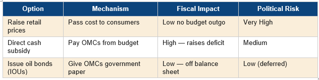 - OMCs are still recovering. A forced price cut before balance sheet recovery is complete would reopen FY2022-23 wounds. The government won’t recapitalise them through the budget.