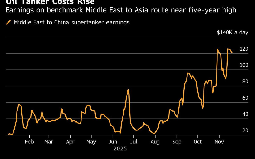 The latest bookings are helping to push up freight rates, with daily costs of hiring an oil supertanker from the Middle East to Asia hovering near a five-year high.