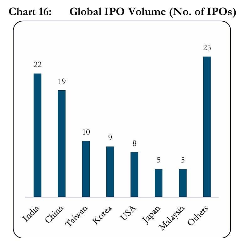 Following a record month of IPO fundraising in October, November remained robust despite a moderation of 18%. 22 companies were listed across NSE, BSE, mobilising Rs 33,507 crore, marking the second-highest monthly resource gathered in FY25. With 22 listings, India led globally in terms of the number of IPOs or IPO volumes.