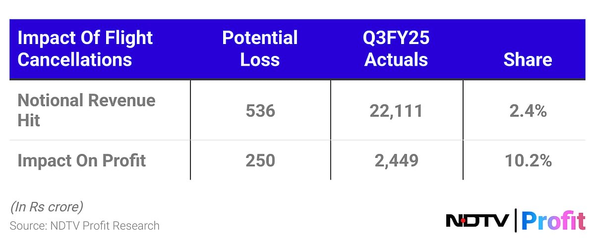 So far, IndiGo has already cancelled about 5,200 flights during the current quarter, incurring an estimated loss of Rs 250 crore. With 109 days left in the winter schedule and 215 flights cut daily, the notional revenue loss could reach Rs 2,414 crore, as per NDTV Profit‘s calculations. This highlights the substantial financial strain caused by operational disruptions during the quarter.