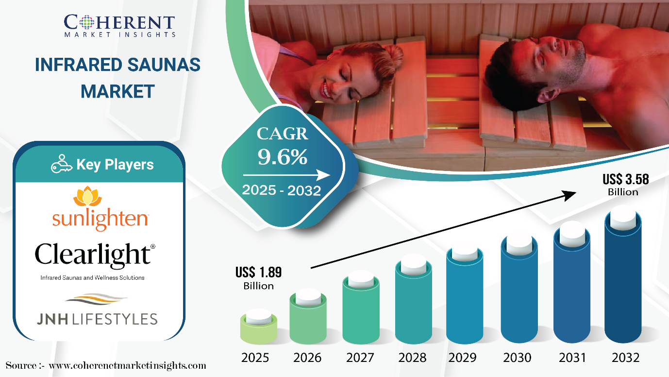 According to Coherent Market Insights (CMI), the global infrared saunas market size is poised to grow at a CAGR of 9.6%, expanding from USD 1.89 Bn in 2025 to USD 3.58 Bn by 2032.