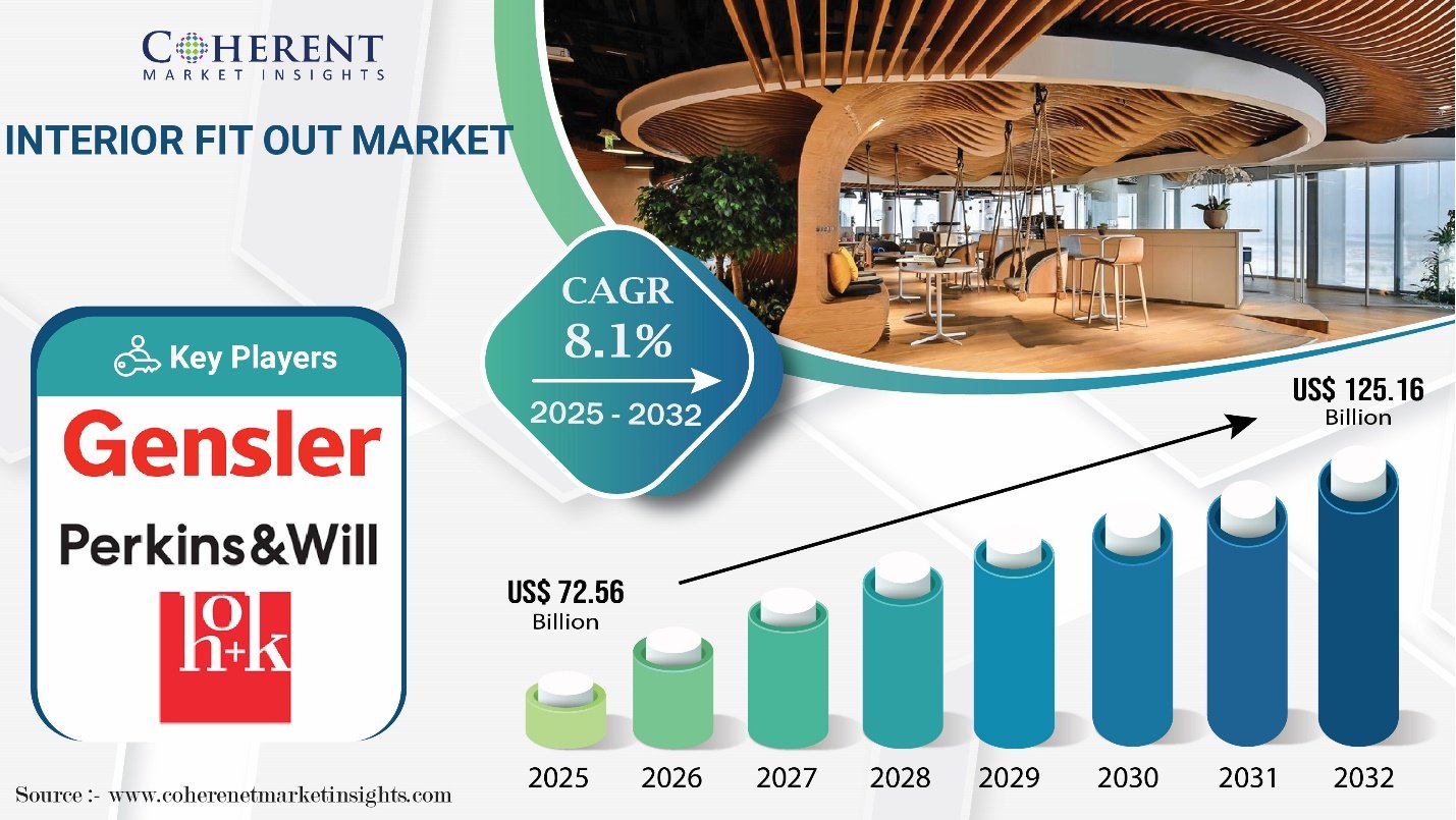According to Coherent Market Insights (CMI), the global interior fit out market size is expected to grow at a CAGR of 8.1% from USD 72.56 billion in 2025 to USD 125.16 billion by 2032.