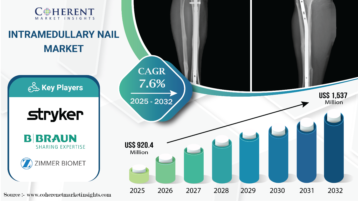 Burlingame, CA, April 10, 2025 (GLOBE NEWSWIRE) — In terms of value, The Global Intramedullary Nail Market size was valued at USD 920.4 million in 2025, is on a trajectory of rapid expansion, with projections indicating it will soar to USD 1,537 million by 2032, growing at a CAGR of 7.6% from 2025 to 2032, as per a recent report by Coherent Market Insights.