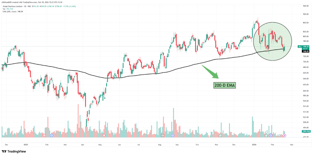 Jindal Stainless Limited is taking support of the 200-day exponential moving average (200-D EMA) at a price of approximately Rs. 748.09. The stock closed at Rs. 758 in Wednesday’s session, reflecting a 2.40 percent increase in the intraday trade.
