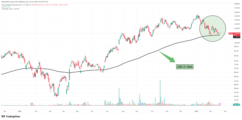 Pondy Oxides & Chemicals Limited is taking support of the 200-day exponential moving average (200-D EMA) at a price of approximately Rs. 1,167.04. The stock closed at Rs. 1,195.40 in Wednesday’s session, reflecting a 0.29 percent increase in the intraday trade.