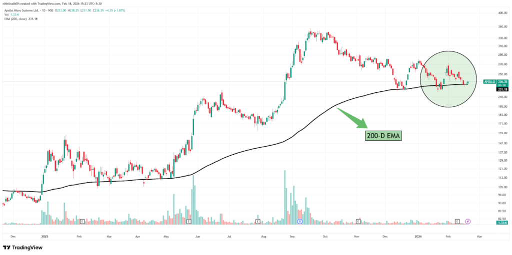 The 200-day Exponential Moving Average (200-D EMA) is widely used to understand a stock’s long-term trend. It places greater importance on recent prices, so it reacts faster to market movements than a simple moving average. Traders and investors track this indicator to judge whether a stock is maintaining an overall uptrend or slipping into a downtrend.