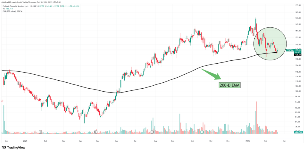 Fedbank Financial Services Limited is taking support of the 200-day exponential moving average (200-D EMA) at a price of approximately Rs. 136.54. The stock closed at Rs. 139.01 in Wednesday’s session, reflecting a 1.03 percent increase in the intraday trade.