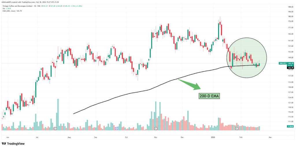 Vintage Coffee & Beverages Limited is taking support of the 200-day exponential moving average (200-D EMA) at a price of approximately Rs. 143.79. The stock closed at Rs. 145.90 in Wednesday’s session, reflecting a 1.31 percent increase in the intraday trade.