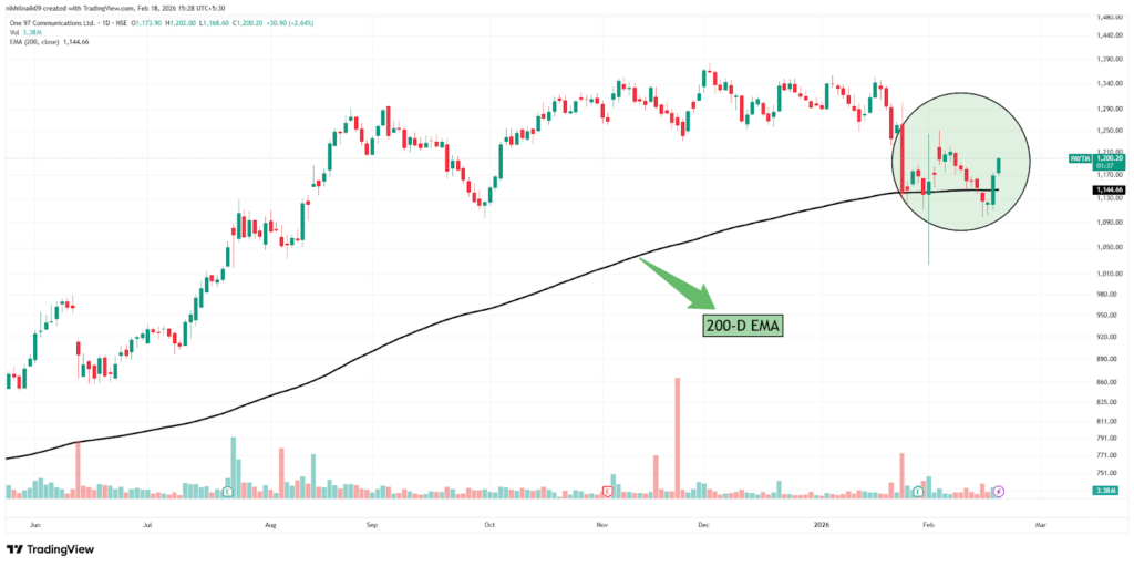 One 97 Communications Limited is taking support of the 200-day exponential moving average (200-D EMA) at a price of approximately Rs. 1,144.65. The stock closed at Rs. 1,199.60 in Wednesday’s session, reflecting a 2.59 percent increase in the intraday trade.