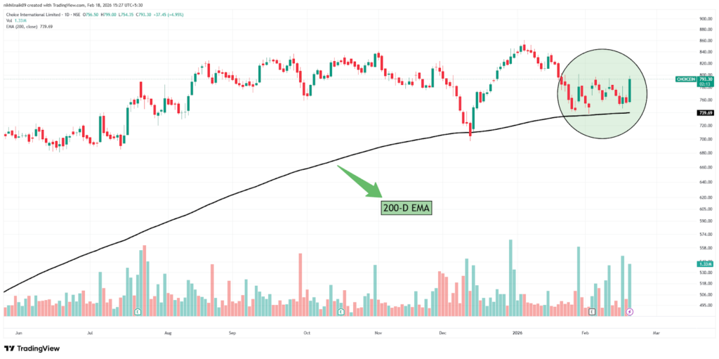 Choice International Limited is taking support of the 200-day exponential moving average (200-D EMA) at a price of approximately Rs. 739.72. The stock closed at Rs. 795.40 in Wednesday’s session, reflecting a 5.23 percent increase in the intraday trade.