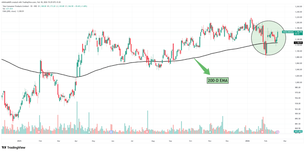 TATA Consumer Products Limited is taking support of the 200-day exponential moving average (200-D EMA) at a price of approximately Rs. 1,128.94. The stock closed at Rs. 1,169.70 in Wednesday’s session, reflecting a 1.85 percent increase in the intraday trade.