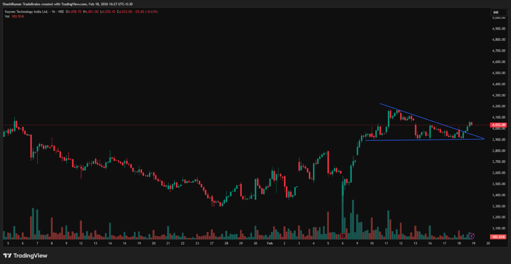 On Wednesday, Kaynes Technology India Ltd broke above the resistance trendline of a descending triangle pattern on the 1-hour chart. Following the breakout above Rs 3,960, the stock witnessed strong buying interest. A sustained move above Rs 3,960 could lead to further upside, while a fall back below this level may weaken the bullish momentum.