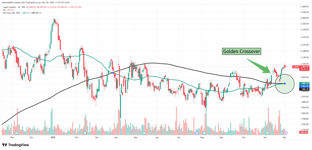 The golden crossover took place on December 01, 2025, at a price of Rs. 1,984.55 with strong volumes of 753.63 K shares. The stock closed at Rs. 2,082.70 in Tuesday’s session, reflecting a 0.04 percent increase in the intraday trade.