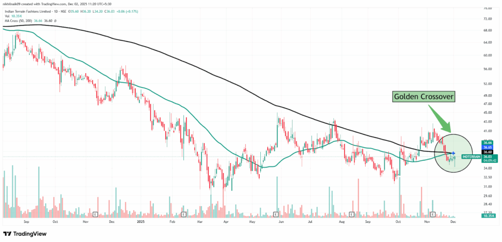 The golden crossover took place on December 01, 2025, at a price of Rs. 36.65 with strong volumes of 23.19 K shares. The stock closed at Rs. 35.96 in Tuesday’s session, reflecting a 0.03 percent decrease in the intraday trade.