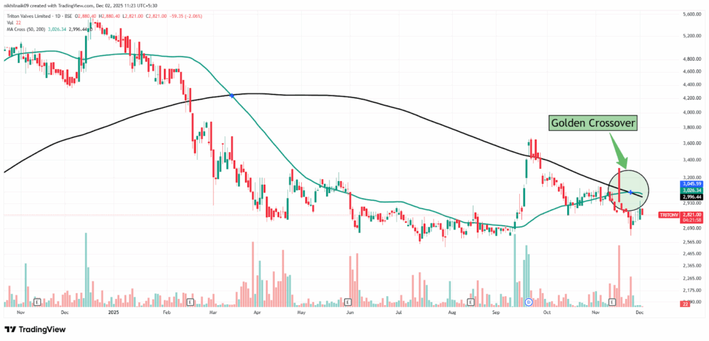 The golden crossover took place on November 25, 2025, at a price of Rs. 3,045.59 with strong volumes of 2.52 K shares. The stock closed at Rs. 2,800 in Tuesday’s session, reflecting a 2.79 percent decrease in the intraday trade.