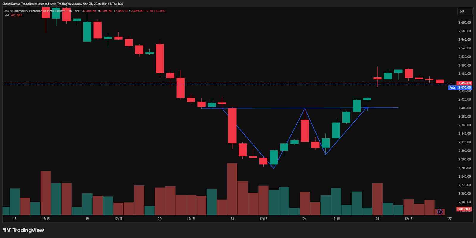 Synopsis: Multi-Commodity Exchange of India Ltd has formed a double-bottom pattern on the 1-hour chart, indicating a potential near-term bullish reversal.