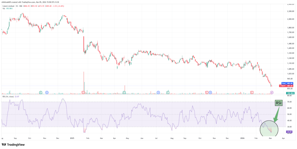 With a market capitalization of Rs. 9,845.27 crores on Thursday, the stock closed at Rs. 886, with an RSI of 22.07, indicating that it is in the oversold zone, offering the potential for an upside bounce.