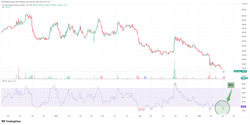 With a market capitalization of Rs. 12,312.87 crores on Thursday, the stock closed at Rs. 418, with an RSI of 29.42, indicating that it is in the oversold zone, offering the potential for an upside bounce.