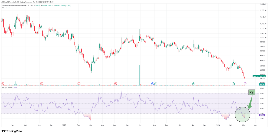With a market capitalization of Rs. 13,886.20 crores on Thursday, the stock closed at Rs. 706.45, with an RSI of 27.04, indicating that it is in the oversold zone, offering the potential for an upside bounce.