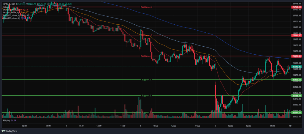 The Nifty 50 Index opened on a negative note at 25,433.80 on Friday, down by 75.9 points from Thursday’s closing of 25,509.70. The index opened on a bearish note and was dragged down to the 25,318.45 level. But later recovered from the day’s low and traded within the 25,300-25,500 range. It traded below the EMAs of 50/100/200 but above the 20-day EMA in the 15-minute chart. In the afternoon session, the index further moved upwards and hit an intraday high of 25,551.25 and settled near the 25,500 level. Overall, the Index traded within a 25,450-25,550 range throughout the afternoon session. During the afternoon session, the Nifty 50 closed below the 50/100/200 EMAs but above the 20-day EMA in the 15-minute time frame.
