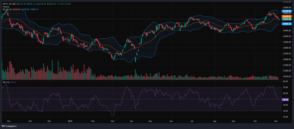 Bollinger Bands (Daily): The index is trading in the lower band of the Bollinger Band range (Simple Moving Average). Its position in the lower range suggests a bearish sentiment, but in the daily time frame on Friday session, the Index formed a Hammer candle, which indicates a bullish reversal signal.  The index took support near 25,318, and 25,551 acted as a resistance level. A sustained move above the middle band signals a bullish sentiment, while a drop back toward the lower band may reinforce bearish sentiment.