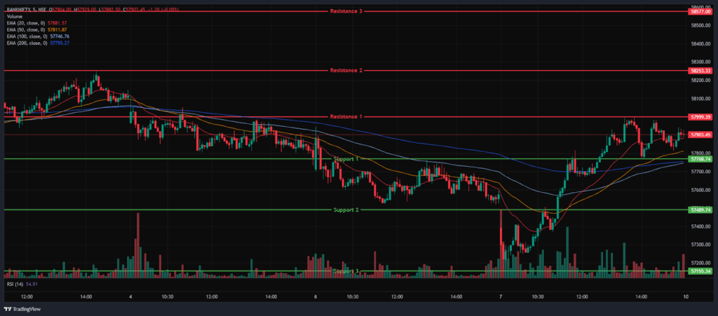The Bank Nifty index had peaked at 58,001.35 and made a day’s low at 57,157.85. Finally, it had closed in green at 57,876.80, rising above the 57,850 level, gaining 322.55 points or 0.56%. The Relative Strength Index (RSI) stood at 60.03, below the overbought zone of 70 in the daily time frame, and Bank Nifty closed above all four EMAs of 20/50/100/200 in the daily time frame.