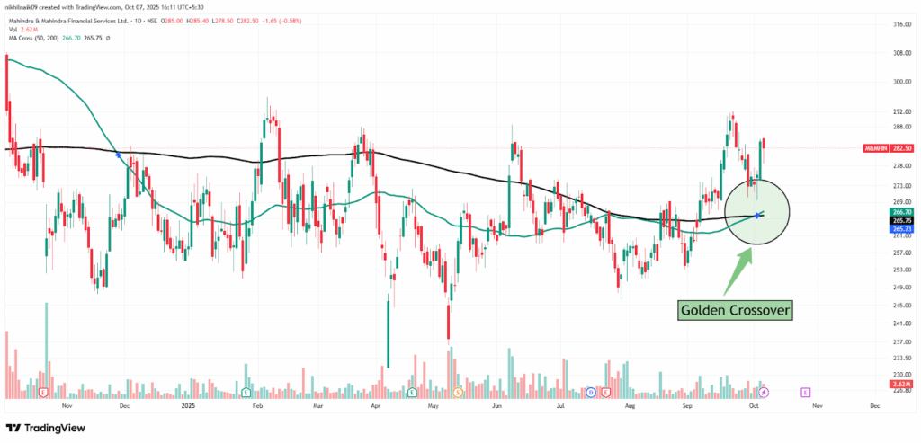 The golden crossover took place on October 3, 2025, at a price of Rs. 265.73 with decent volumes of 2.04 M shares. The stock closed at Rs. 282.50 in Tuesday’s session, reflecting a 0.58 percent decrease in the intraday trade.