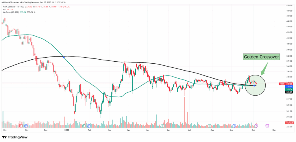 The golden crossover took place on October 3, 2025, at a price of Rs. 335.44 with decent volumes of 8.51 M shares. The stock closed at Rs. 338 in Tuesday’s session, reflecting a 0.32 percent decrease in the intraday trade.
