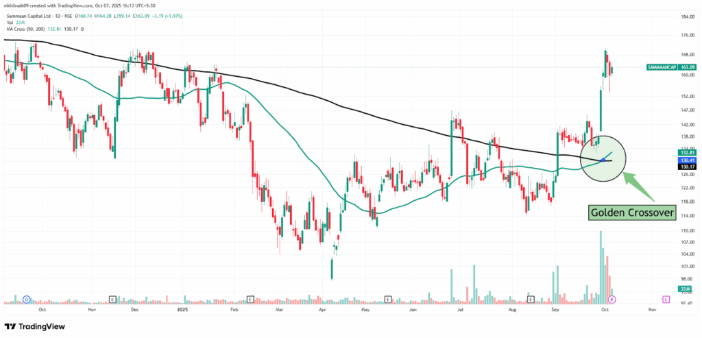 The golden crossover took place on September 30, 2025, at a price of Rs. 130.41 with strong volumes of 119.56 M shares. The stock closed at Rs. 163.09 in Tuesday’s session, reflecting a 1.97 percent increase in the intraday trade.