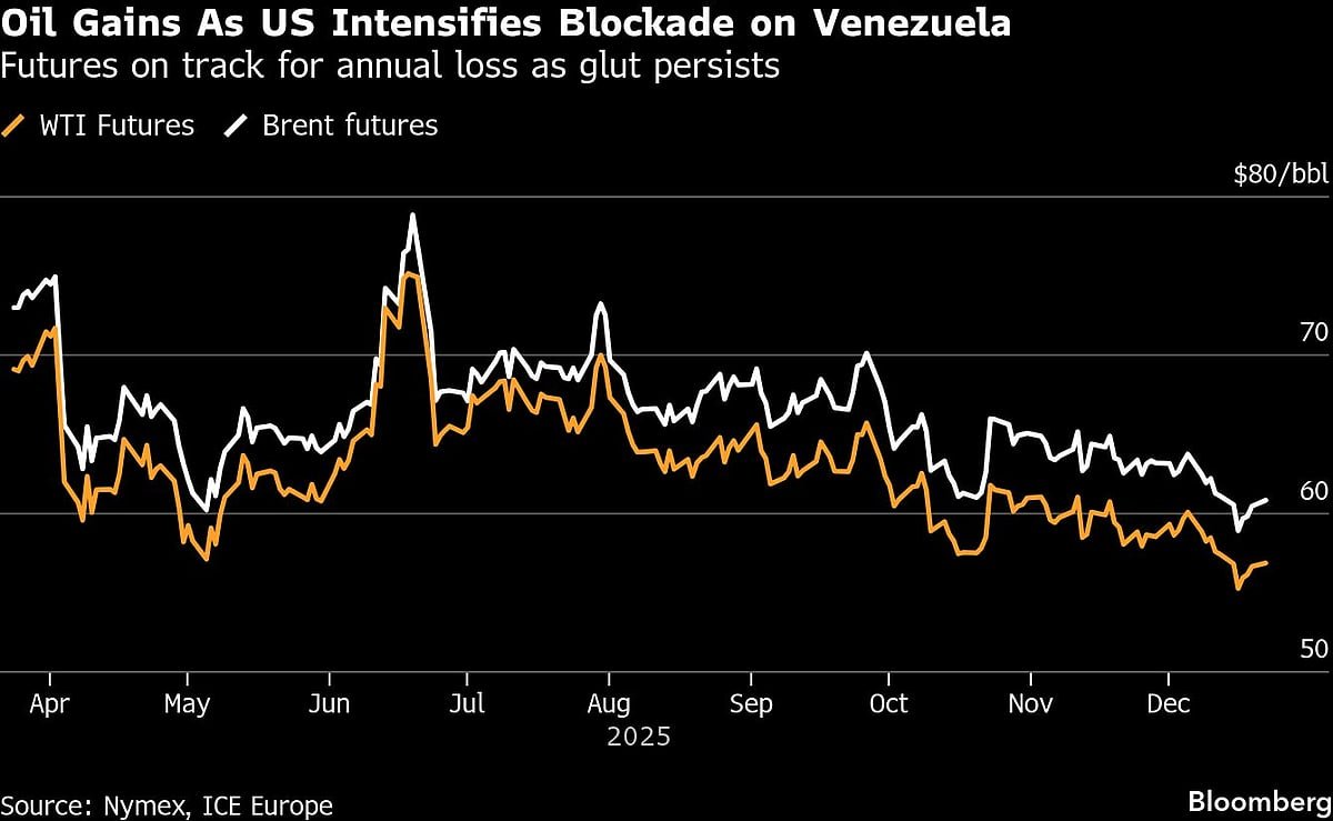 Oil rose as President Donald Trump intensified a blockade on Venezuela, with US forces boarding one tanker and pursuing another within weeks of first capturing a vessel.