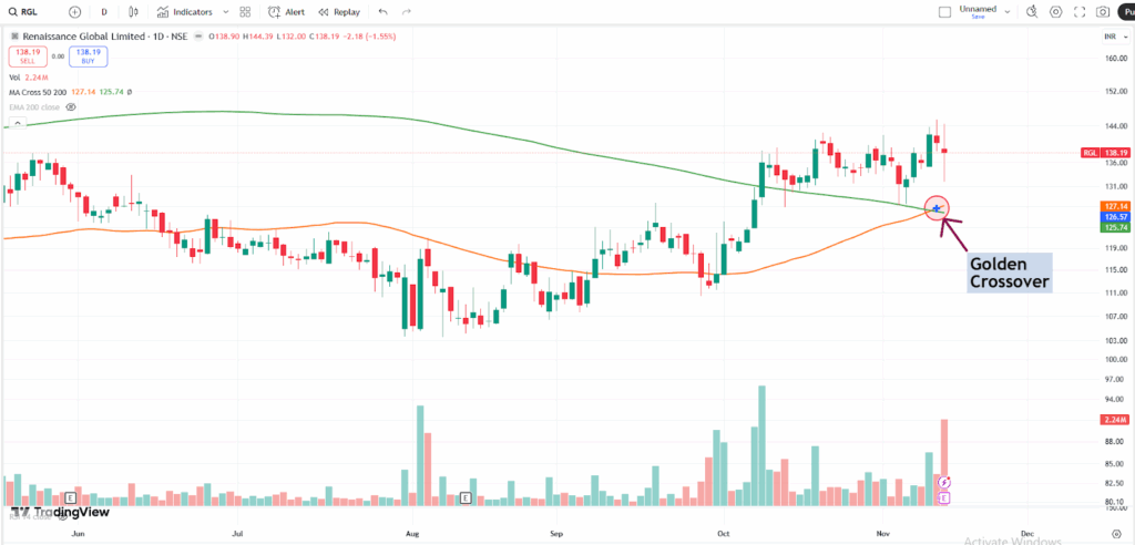 The golden crossover took place on November 13, 2025, at a price of Rs. 126.57 with decent volumes of 807.38 K. The stock closed at Rs. 136.50 in Friday’s session, reflecting upto a 2.6 percent decline since the crossover.