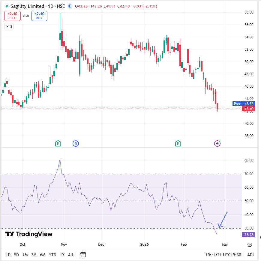 With market capitalization of Rs. 19,919.05 cr, the shares of Sagility Limited are closed at Rs. 42.55, down by 1.80 percent from its previous close of Rs. 43.33 per share. The stock’s current RSI of 25.28 indicates it is oversold and may catch investor’s attention for a possible rebound if buying momentum rises.
