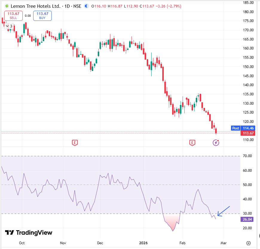 With market capitalization of Rs. 9,068.05 cr, the shares of Lemon Tree Hotels Limited are closed at Rs. 114.46, down by 2.11 percent from its previous close of Rs. 116.93 per share. With a current RSI of 26.04, the stock is considered oversold and may attract investor interest for a potential rebound if buying activity increases.