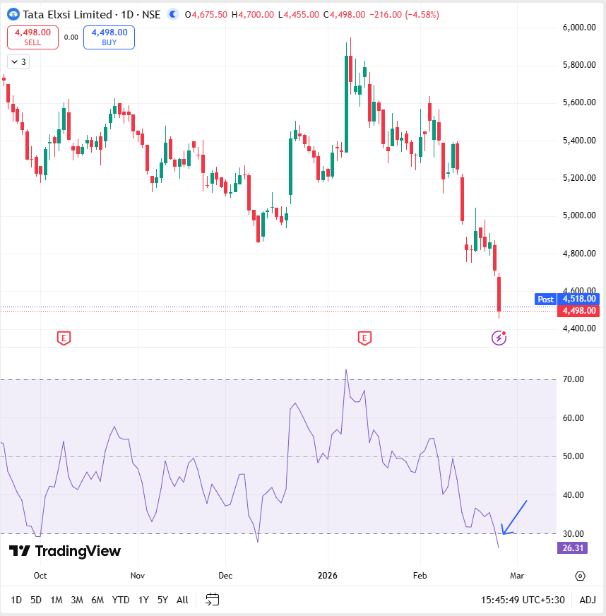 With market capitalization of Rs. 28,145.23 cr, the shares of Tata Elxsi Limited are closed at Rs. 4,518, down by 4.16 percent from its previous close of Rs. 4,714 per equity share. With a current RSI of 26.31, the stock is technically in oversold territory and may attract investor attention for a possible rebound if buying momentum strengthens.