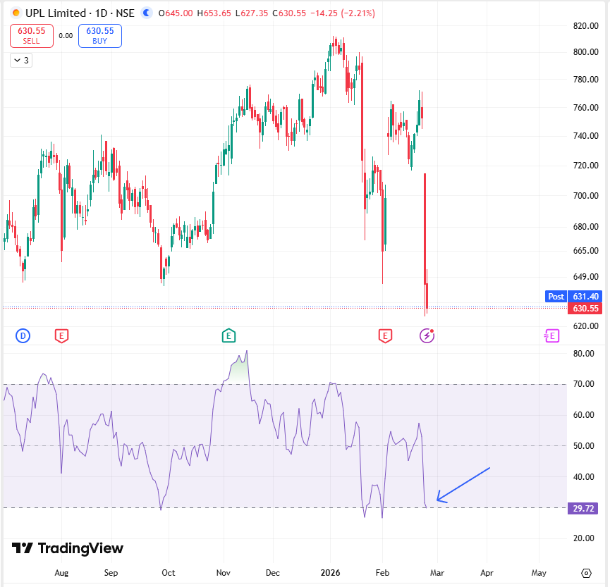 With market capitalization of Rs. 53,300.55 cr, the shares of UPL Limited are closed at Rs. 631.40, down by 2.08 percent from its previous close of Rs. 644.80 per share. With a current RSI of 29.72, the stock is technically in oversold territory and may attract investor attention for a possible rebound if buying momentum strengthens.