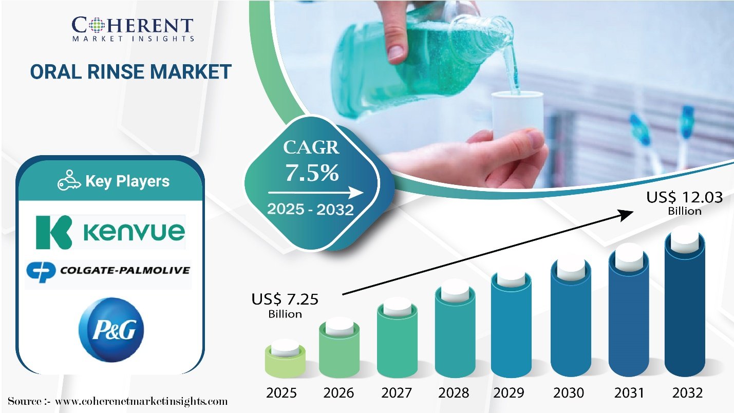 Burlingame, CA, Sept. 17, 2025 (GLOBE NEWSWIRE) — The Global Oral Rinse Market is estimated to be valued at USD 7.25 Bn in 2025 and is expected to reach USD 12.03 Bn by 2032, exhibiting a compound annual growth rate (CAGR) of 7.5% from 2025 to 2032. Market growth is propelled by rising awareness of oral hygiene, the increasing incidence of dental diseases, and the launch of innovative oral care products. Additionally, the expanding middle-class population and higher disposable incomes in emerging economies are playing a pivotal role in driving market expansion.